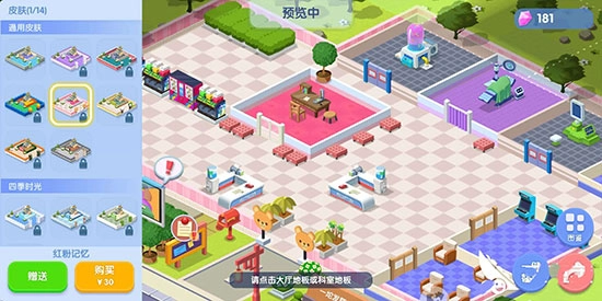 点击“皮肤”按钮后,左侧会弹出皮肤选择栏。选择心仪的皮肤后,点击大厅和科室的地板就能更换皮肤。大厅与科室可选用不同皮肤,打造个性化的装饰效果。