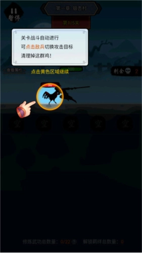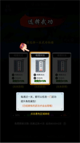 5、每通关一关,都可以选择任意一门武功,以此来提升角色的属性;