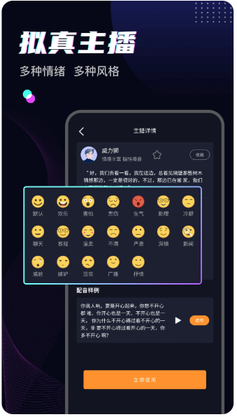 3、多类型合成主播:男声、女声、童声以及方言可随意切换,发音人由您自由选择。