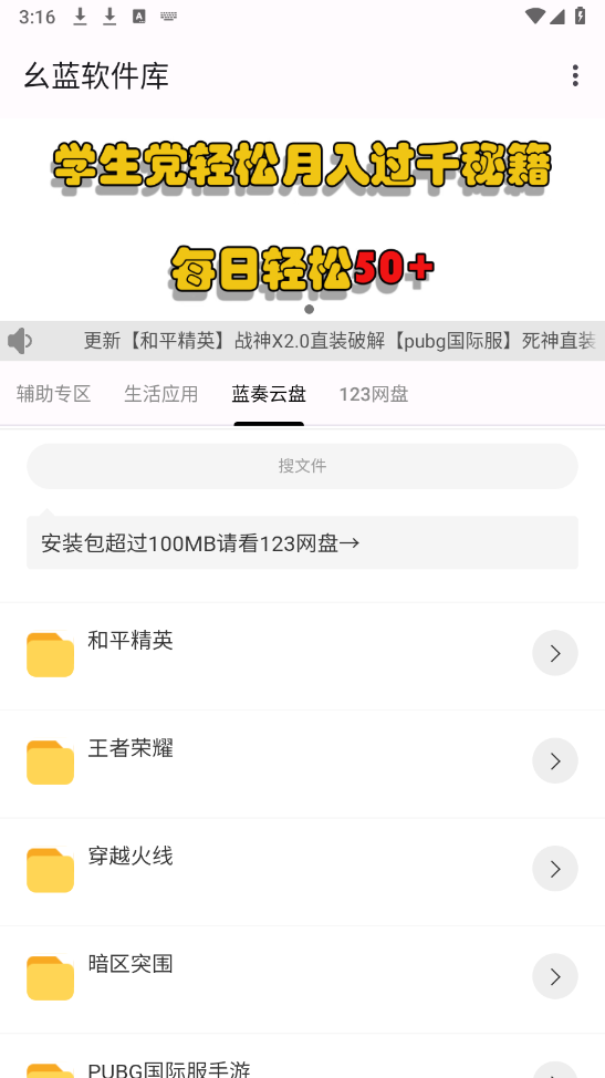 进入首页后,能看到不少分类选项,像辅助专区、生活应用和蓝奏云盘之类的都包含在内。