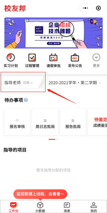 1、校友邦教师版首页展示如下,若您身兼管理员与指导老师双重身份,可在图中所示的“切换角色-管理员”位置进行操作,这样就能查看您管理范围内的计划了。