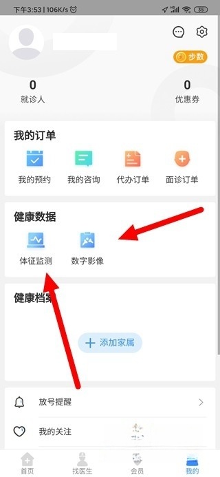 1、完成各项检测后,数据会自动同步至软件,可在“个人中心”的“健康数据”中查看,该板块包含“体征监测”与“数字影像”两部分内容。