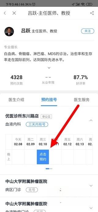 3、进入医生详情页面后,这里会展示医生最近一周的出诊安排,点击您想预约的具体时段就能完成预约操作。