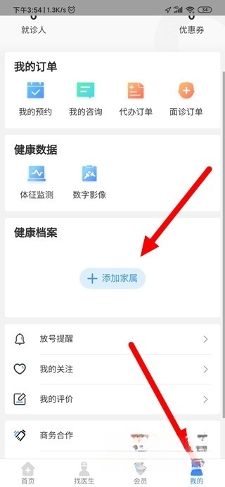 1、若要完成实名认证,需先进入“我的”页面,找到“健康档案”选项,再点击“添加家属”。