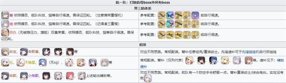 2、航一队,航队是比较常用的boss队。它的优势在于手动操作时表现更出色,能更好地吃到辅助加成,组队也相对简单;不过缺点是对付航母boss和20秒盾时会稍显吃力,对装备的要求也比较高。因为航队有不少可以选择的辅助舰船,所以通常会把海伦娜留给战列队使用;要是自身实力足够强的话,这条建议可以不用在意。航队具备存空袭的手段,能够针对性地解决复苏之风这类难点,或者主动避开带有盾系词条的敌人;一般主要用来应对战列boss,高效清理重巡,顺便打击轻甲目标。