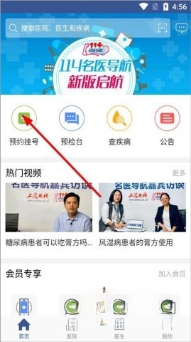 1、打开114名医导航并登录,进入首页后,能看到预约挂号、预检台、查疾病、公告等功能栏,同时也可以浏览热门视频,接着点击预约挂号选项;