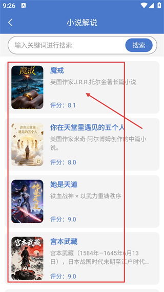 3、进入【小说解说】页面后,既可以借助顶部的搜索框输入关键词进行检索,也能够直接从列表里挑选【魔戒】这类作品来查看详细信息。