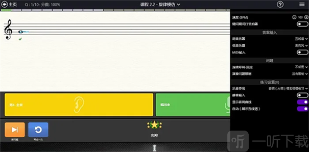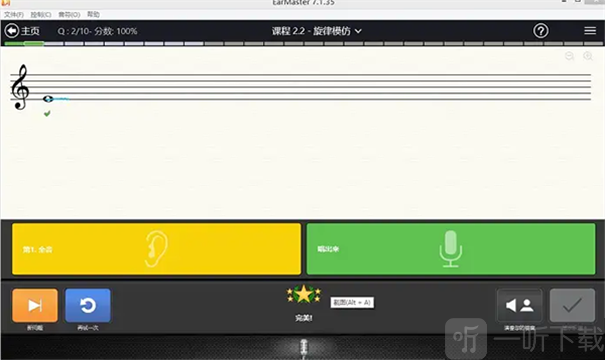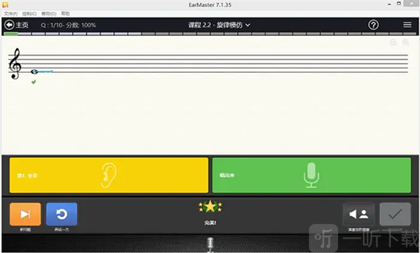 1、点击“新示例”后,会播放一个单音,你需要用麦克风模仿这个听到的音进行演唱。完成模仿后,界面上方的五线谱里会显示出你所唱的音符(示例图如下)。点击界面右下角的“演奏您的答案”按钮,就能听到自己演唱的内容,以此判断是否准确。