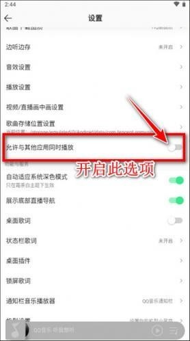 4、开启“允许与其他应用同时播放”开关后,QQ音乐就不会被中断播放了,即便你在进行微信通话或钉钉视频会议,也能继续听歌。