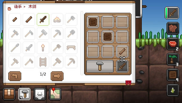 游戏下方的合成书里会显示已获得的图纸,通过图纸能了解制作工具所需的材料以及对应的工具台。不少工具必须借助工具台才能制作,所以需要先用手头的材料做出基础工具台,之后就能用它来制作更高级的工具台了。