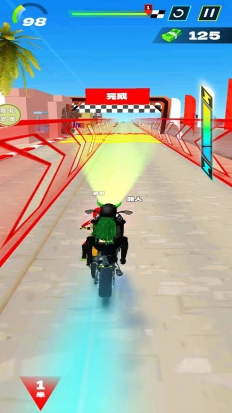 3、全程高能极速冲刺到达终点,时刻保持警惕观察前方道路信息完成挑战,这也能收获到丰富的资源材料。