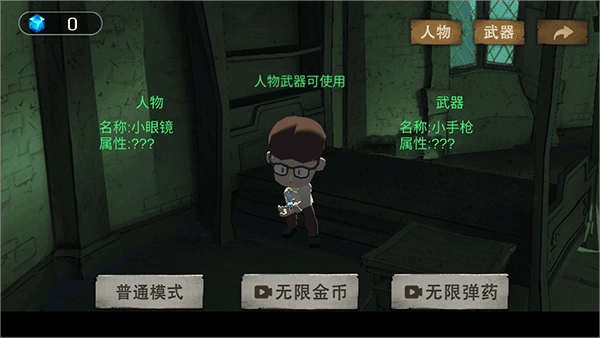 4、玩家可在此选择普通模式开启游戏,也能通过观看广告解锁额外模式与武器。游戏操作方式简单轻松,便于灵活操控角色展开冒险,助力玩家获取更多奖励,进而升级、购买装备与设施。