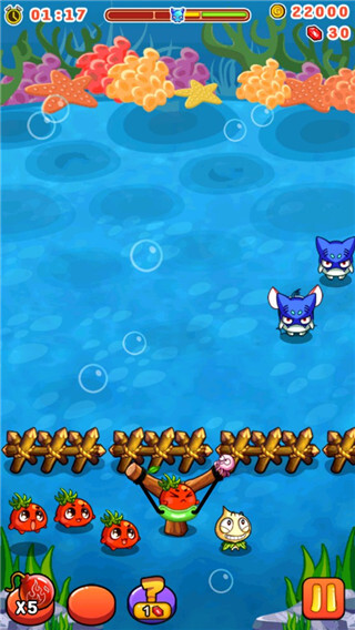 玩家通过在屏幕上点击滑动,操控弹弓将蔬菜发射出去攻击怪物。