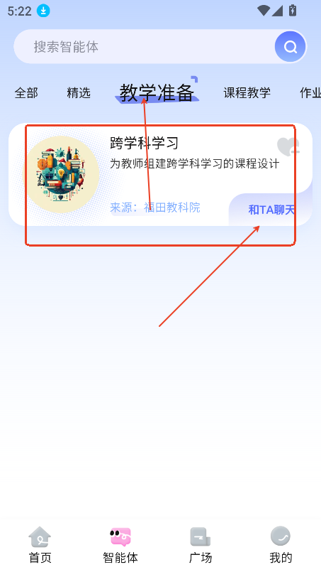 3、比如选择教学准备,选择智能体进入,点击与它聊天
