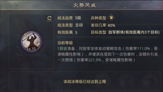 火威迸发:需要1回合准备时间,随后对敌方全体施展策略攻击(伤害率111%,效果受谋略属性加成),同时让目标在承受下一次伤害时,会额外触发一次强力火攻(伤害率221%,效果受谋略属性加成)