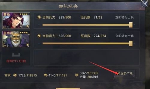 5、再点击右下方的立即征兵选项,再滑动上方的滑块即可。