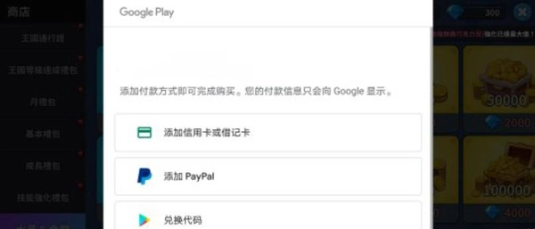 3、点击充值按钮后,会弹出付款方式选择窗口。国际服的充值流程不像国内游戏那么便捷,海外充值通常需要使用借记卡、信用卡或PAYPAL(功能类似国内的支付宝、微信支付);若没有这些支付方式,建议通过代充平台完成充值。