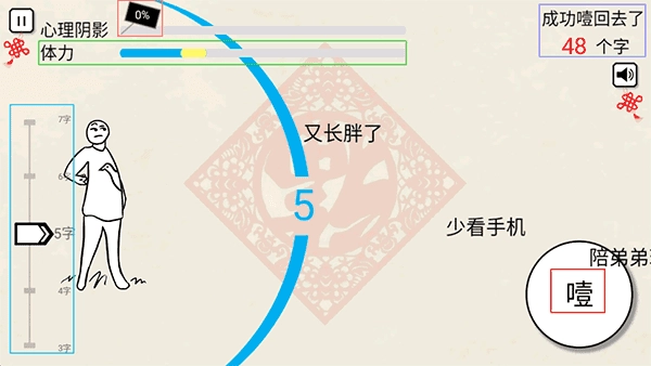 3、“你”字右侧的半弧会显示本次可噎住的范围以及单次能噎回的最大字数,若半弧呈红色,则意味着当前体力不足 4、突然出现的亲戚的嘱(dan)托(mu),字数最少为三个字,最多为七个字。