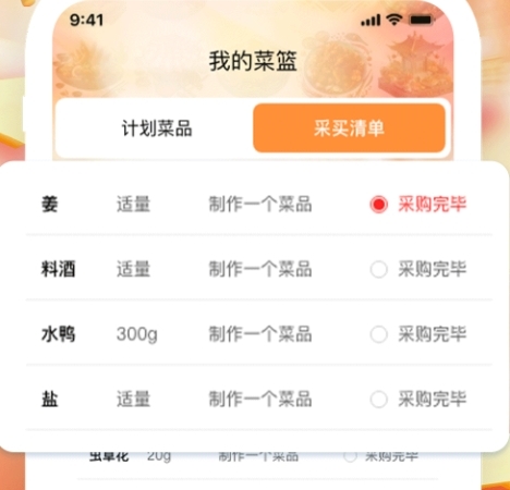 2、菜谱中的每一项材料都会单独列出,方便用户去菜场选购时无需反复打开软件查看,还能直接一键复制材料清单。