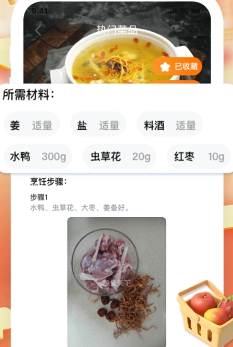 当用户遇到想尝试的菜品时,只需一键就能把它收藏到“我的收藏夹”里,既方便随时查看和制作,系统还会自动生成采购清单。