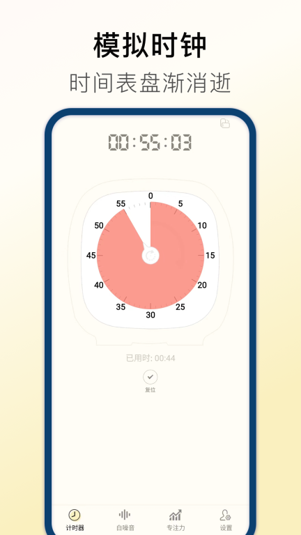 3、【专注计时器】采用极简主义设计风格,可自由设定专注时长,助力用户持续突破自身专注力极限。