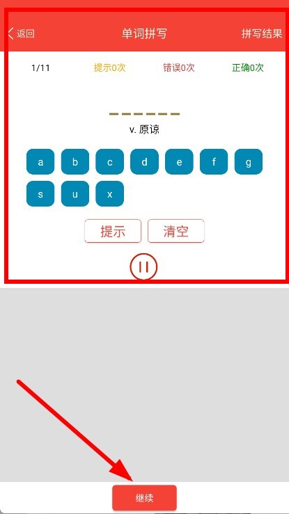 4、根据提示进行单词拼写,完成后点击继续。