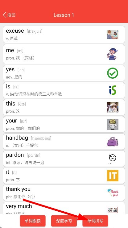 2、在课程选择页面,点击Lesson1,进入该课的单词学习页面。