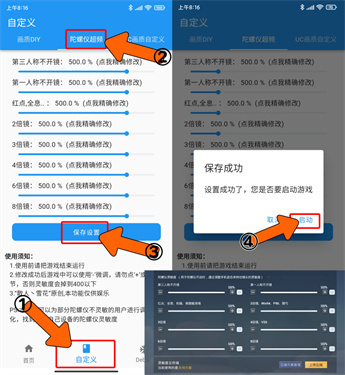 3、调整适合自己的陀螺仪灵敏度后,点击保存设置,设置成功后点击启动即可。
