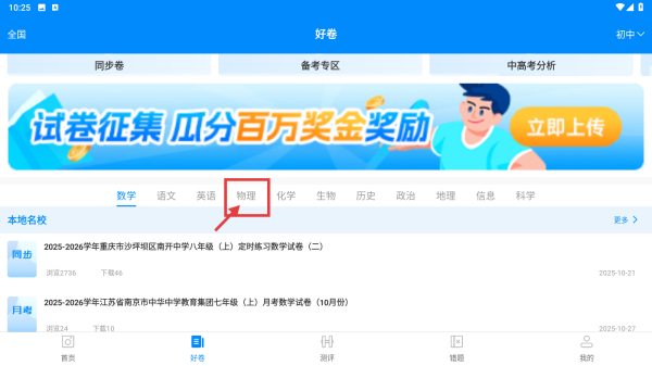 2、在好卷页面,点击物理学科选项,浏览物理学科试卷列表。