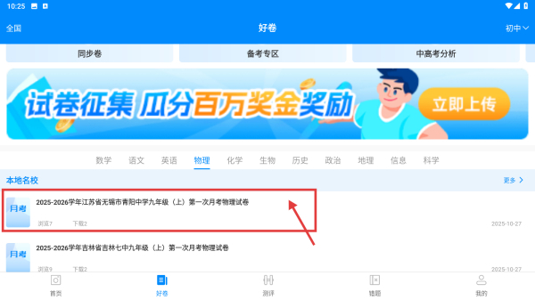 3、在物理学科试卷列表里,找到2025-2026学年江苏省无锡市青阳中学九年级第一次月考物理试卷条目,点击进入试卷详情页。
