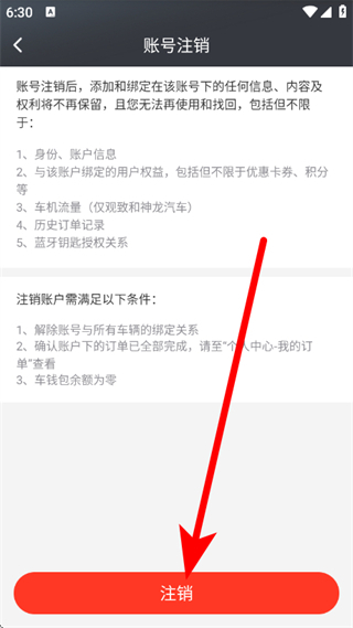5、在账号注销页面,确认满足注销条件后,点击注销,完成账号注销操作。