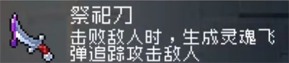 1、祭祀刀:击败敌人时,生成魔法球追踪攻击敌人,打团怪还好,尽量是血不高的,群伤角色就不太需要了,打单体boss显得非常无用。