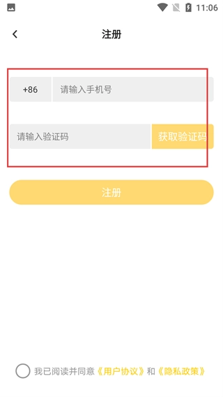 3、进入注册页面后,先在【+86】右侧的输入框中填写手机号码,接着点击【获取验证码】按钮,随后把收到的验证码输入到对应的输入框内。
