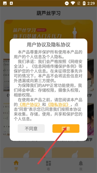1、在葫芦丝学习的用户协议与隐私协议弹窗里,仔细阅读相关条款后,点击【同意】按钮,即可继续后续的应用使用流程。