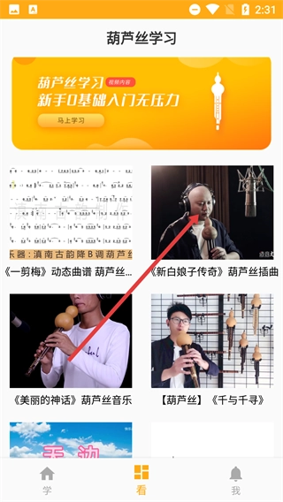 2、在首页,点击底部导航栏的【看】选项,进入葫芦丝相关内容的展示页面。