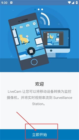 2、在【欢迎】界面,明确【LiveCam】可将移动设备转为监控摄像机,点击【立即开始】进入功能配置环节。