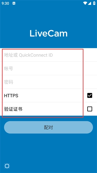 3、进入【LiveCam】配置页面,需要填写【地址或QuickConnect-ID】【帐号】【密码】,确认【HTTPS】的勾选状态后点击【配对】按钮。