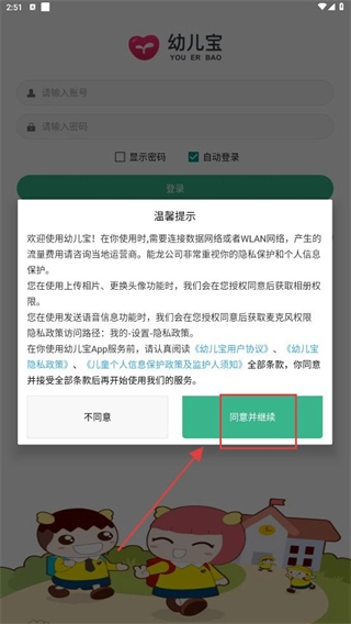 1、首次进入【幼儿宝】,点击【同意并继续】,确认用户协议,进入应用流程。