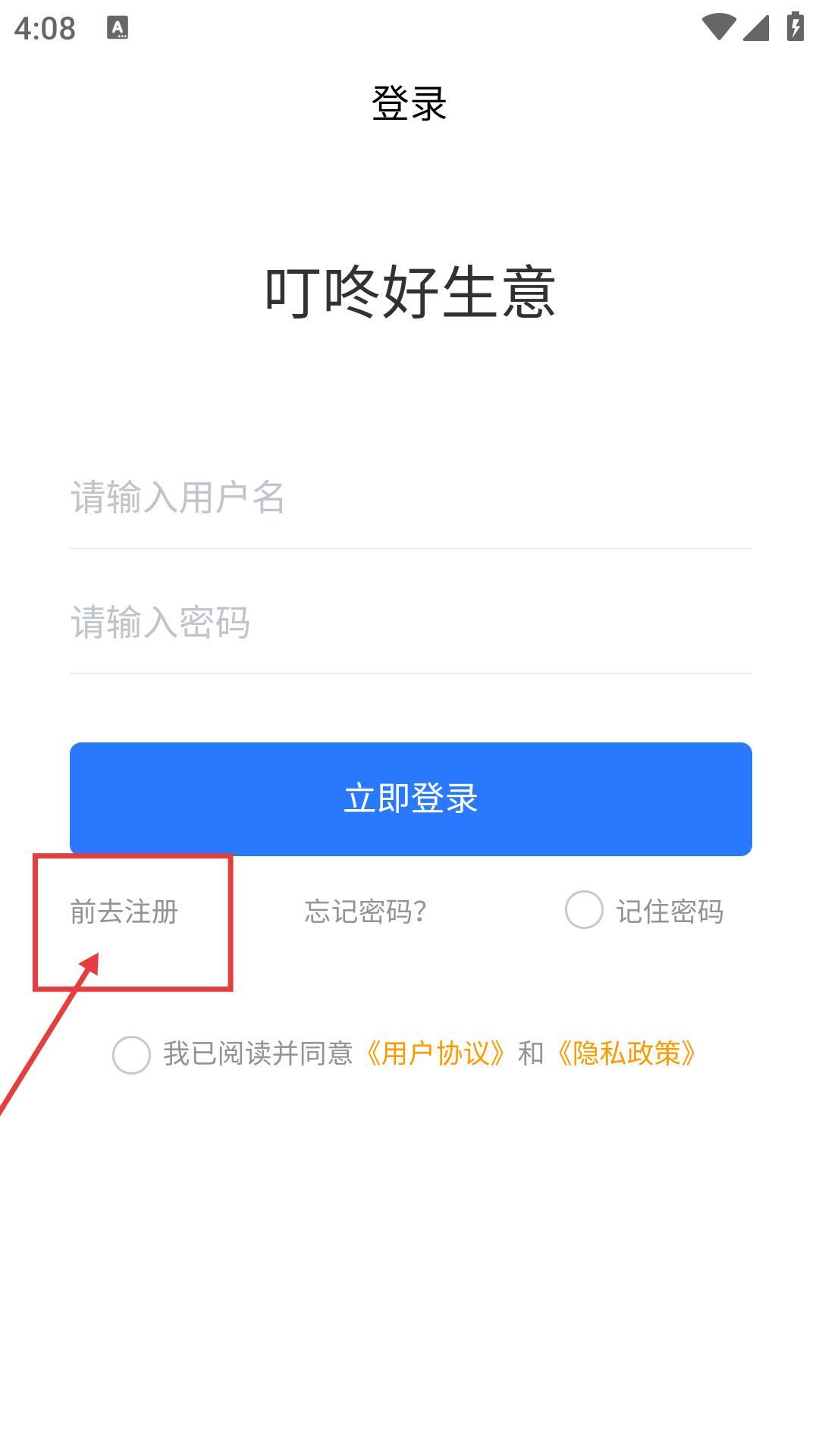 1、在“叮咚好生意”登录界面,若未注册账号,点击【前去注册】,可进入用户注册流程。