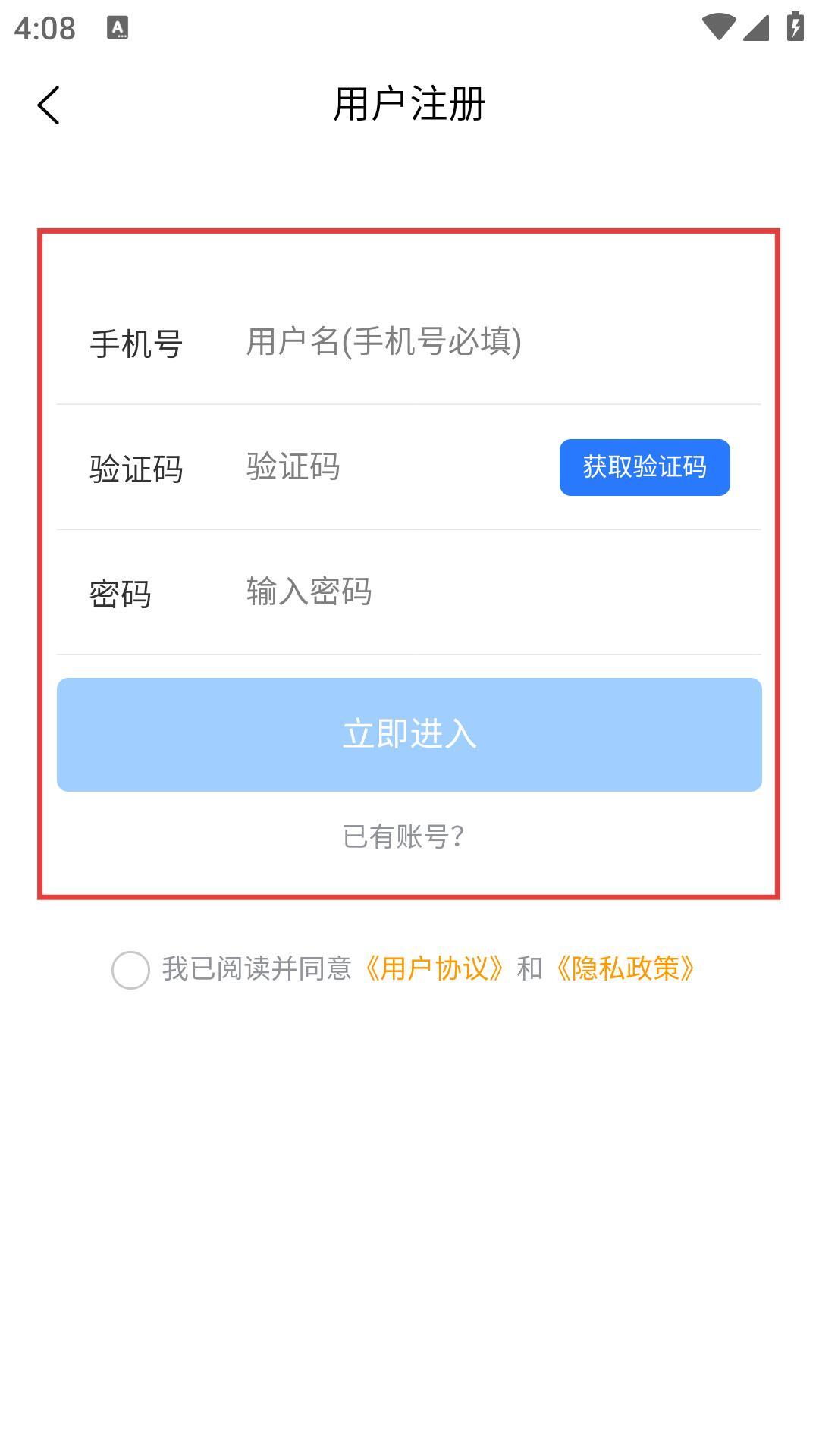 2、注册时请按顺序填写【手机号】【验证码】【密码】,勾选同意用户协议与隐私政策后,点击【立即进入】按钮,即可完成注册流程。