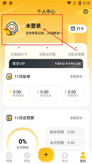 1、在【点滴记账】主界面,点击右下角【我的】按钮,进入个人中心入口。