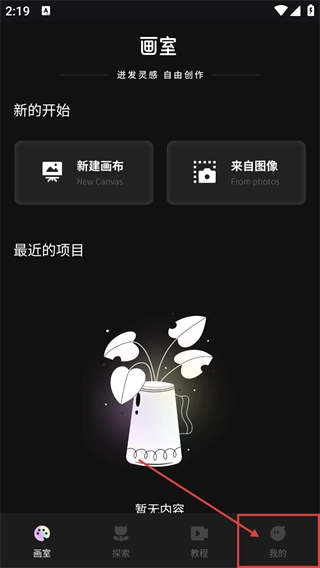1、在【画室】主界面,点击底部导航栏的【我的】选项,即可进入个人中心页面,在该页面能查看登录/注册、会员开通等功能的入口。