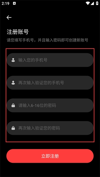 4、进入注册页面后,请依次完成以下操作:首先填写【手机号】并进行二次验证,接着设置6-16位的密码并再次验证密码,所有步骤完成后,点击【立即注册】按钮,即可成功创建账号。