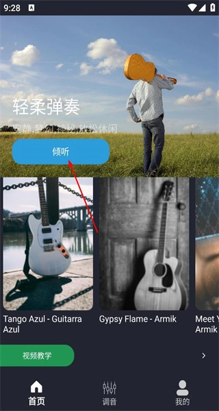 首页呈现轻柔弹奏的相关内容,设有倾听按钮,按钮下方陈列吉他相关曲目;点击倾听按钮后,将跳转至播放界面。
