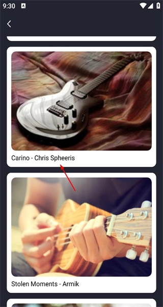 3、列表页面呈现多首吉他曲目,每首曲目都配有对应的吉他图片,并标注了歌曲名称和创作者信息,用户可点击具体的曲目进行后续操作。