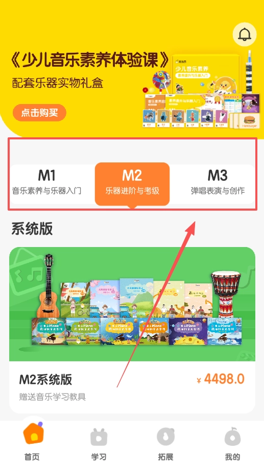 登录后可以从首页开启探索之旅,那里有系统课程和体验课的推荐内容,点击购买即可获得包含实物乐器的礼盒。