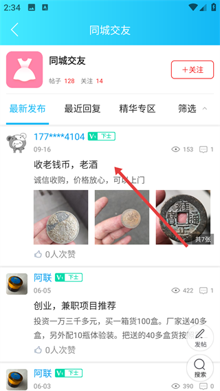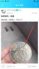 3、在同城交友板块里,找到目标帖子(例如“收老钱币,老酒”这类),点击进入帖子的详情页面。