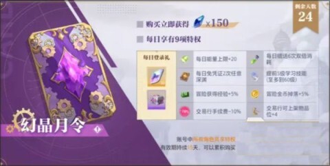 4. 幻晶月令,拥有月卡的玩家可以增加每日经验上限,额外获得深渊任务的两次票券,划算之余还可享受各类特权活动,为冒险之旅确保经验的提升!