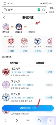 3、接着添加需要对比的院校,系统支持同时对比五所学校,添加完毕后点击“立即对比”按钮即可。