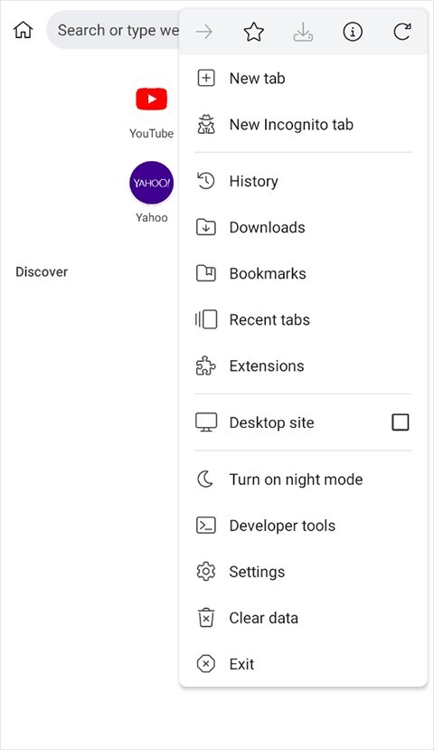 2、接着打开Kiwi浏览器,点击右侧的三个点图标,找到扩展程序选项。